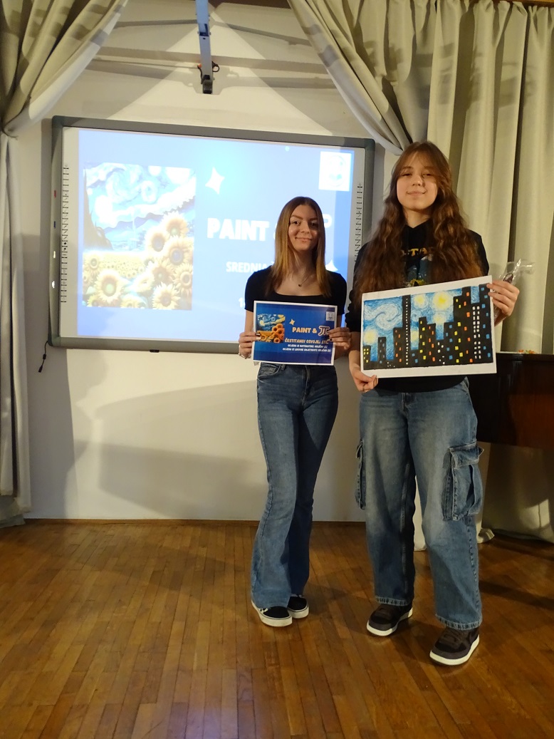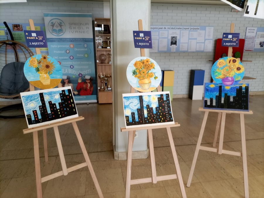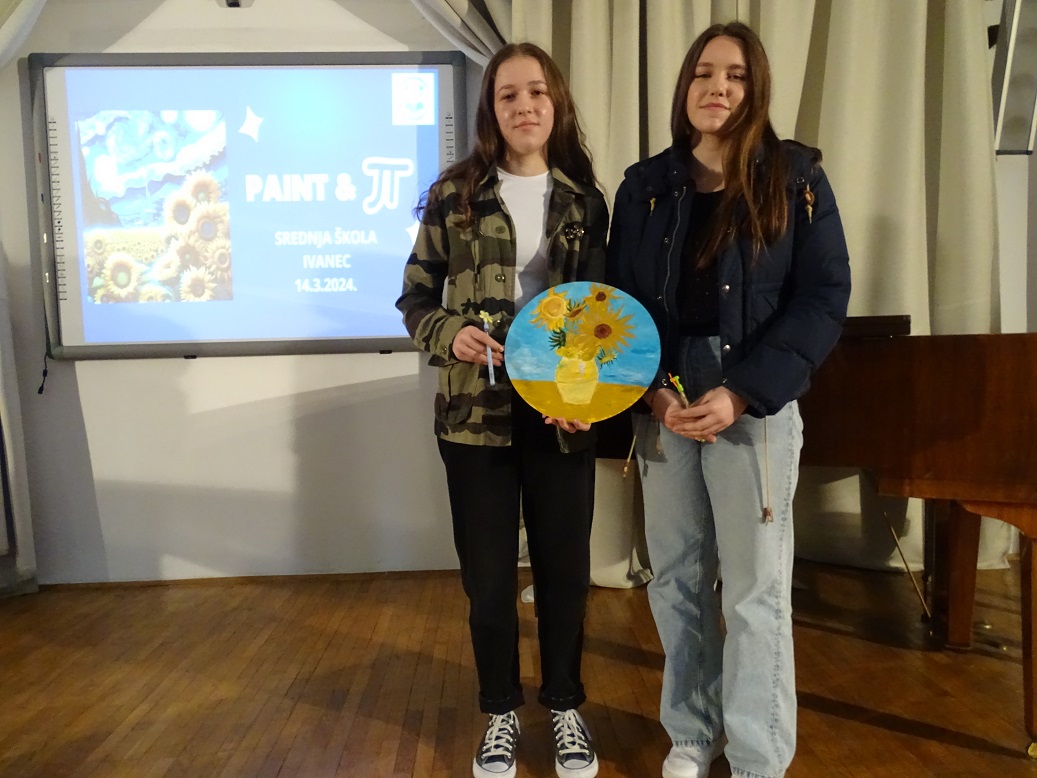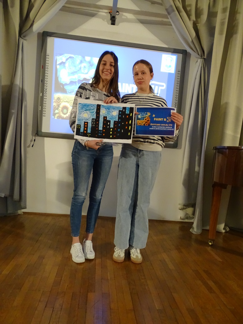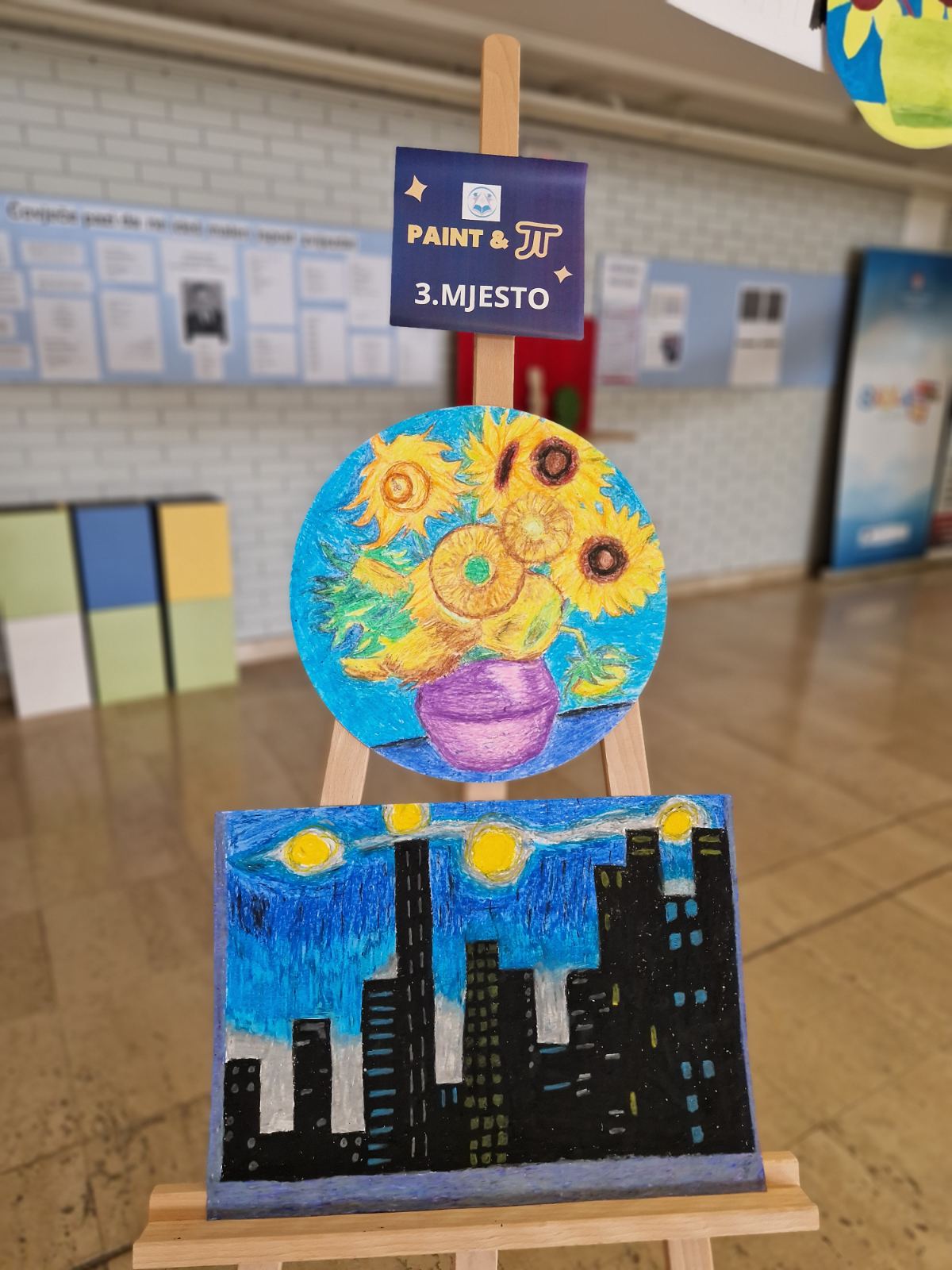 U četvrtak 14.3. u našoj je školi u potpunosti vladao duh umjetnosti i matematike. Na nešto drugačiji, opušteniji i kreativniji način učenici naše škole proslavili su sa svojim nastavnicama matematike Svjetski dan matematike i Dan broja π. Sve je počelo u 10:00 sati u amfiteatru škole gdje se okupilo 80-tak prijavljenih učenika zainteresiranih za sudjelovanje u radionici PAINT&π . Učenici su prvo pogledali zanimljiv i edukativan video o Vincentu van Goghu i njegovim poznatim umjetničkim dijelima u kojima pronalazimo korelaciju s matematikom i fizikom. Osim toga, učenici su pogledali i zanimljiv dijalog između Vincenta van Gogha i broja π kojega su osmislile i izradile učenice 1.G razreda, Lea Križanec i Lukrecija Hojsak. Malo je reći da smo uz njihov video iskreno uživali i nasmijali se. Nakon prikazanih videa, učenici su odigrali Kahoot kviz koji se nadovezao na video učenica, a najbrže i najtočnije u odgovorima bile učenice Sara i Petra Bednjički iz 1.G razreda.