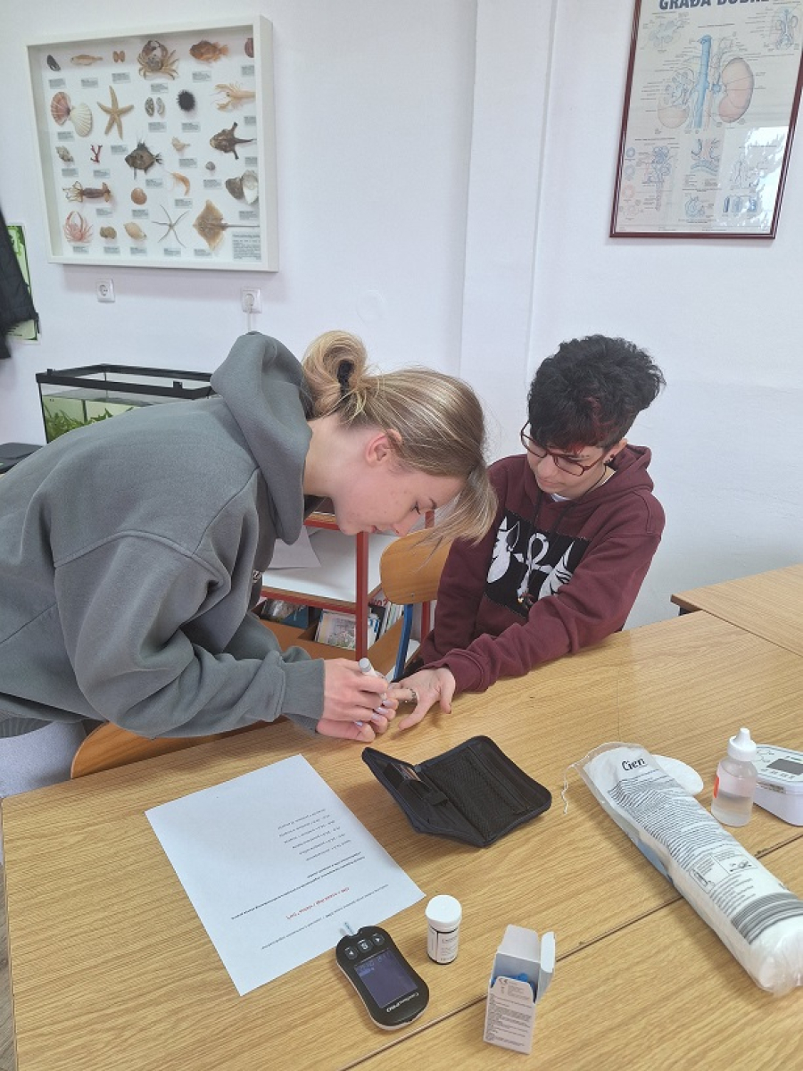 U srijedu, 12. studenoga, učenici 4.G2 razreda na satu Biologije obilježili su Svjetski dan borbe protiv šećerne bolesti. Tom su prigodom učenici izračunavali svoj ITM (indeks tjelesne mase) i uspoređivali ga s kriterijima Svjetske zdravstvene organizacije. Mjerili su jedni drugima krvni tlak, a oni hrabriji okušali su se i u mjerenju razine glukoze u krvi. Učenici su pritom ukazali na važnost prevencije bolesti, koja uključuje uravnoteženu prehranu, redovitu tjelesnu aktivnost i održavanje odgovarajuće tjelesne mase, a sve to zajedno doprinosi boljem zdravstvenom stanju.