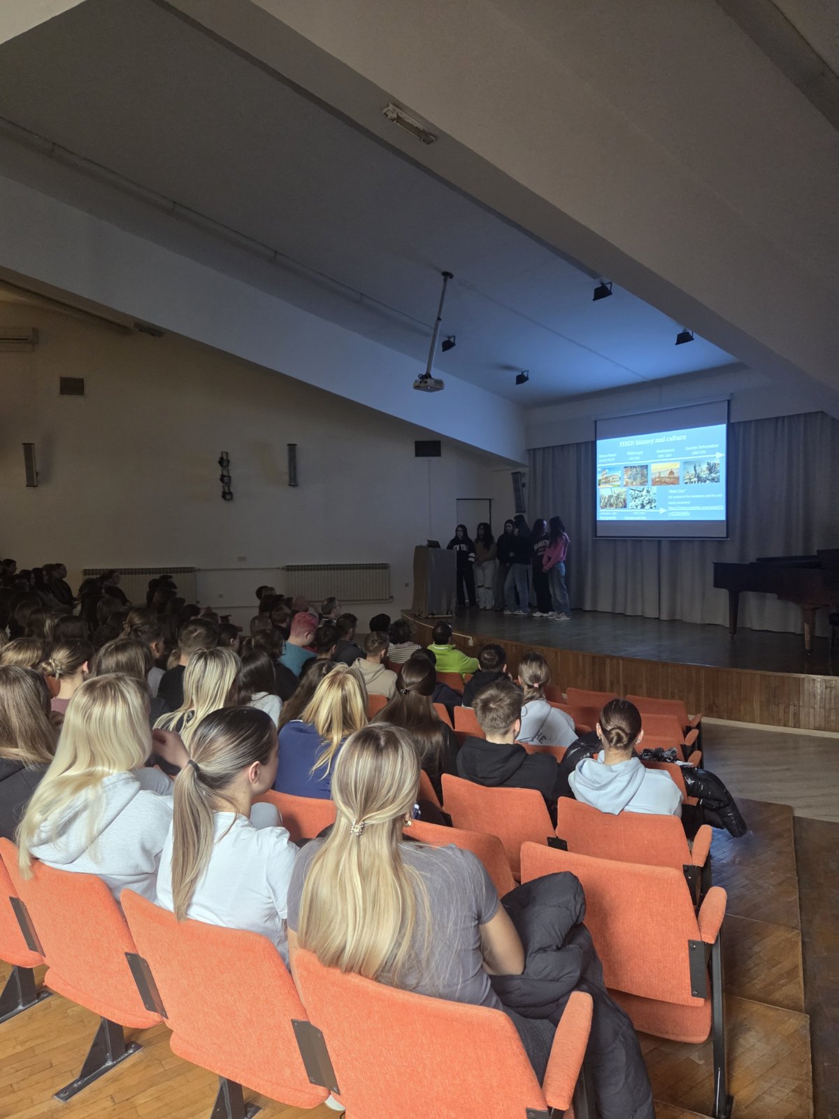 Naše su gošće u školskom amfiteatru održale predavanje na kojem su predstavile svoju državu, regiju Apuliju, grad Bari i školu koju pohađaju. Bila je to zanimljiva prezentacija tijekom koje su učenici i nastavnici naše škole čuli osnovne informacije o talijanskom obrazovnom sustavu te o istom mogli postaviti različita pitanja.